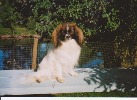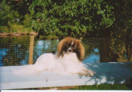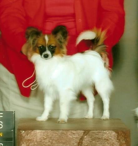 Louann and I were very fortunate when we were able to purchase Am. Ch. Marimar's Willow(Cindy) from her breeder Mary Maher. What a nice girl with a lovely calm disposition. So far she has provided us with 4 lovely female puppies including Cocoa (Ch. Animato Annacott Devinechoklat) our latest Best Puppy in Show winner. What an achievement for a phalene puppy. Cindy was my re-introduction to the phalene world. She is sired by my Cos (Ch. Apsara's Cossack Dancer).