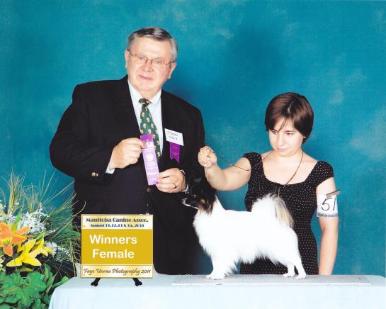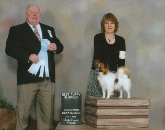 Society is a very pretty, sound little girl. She won her first points, a three point Best of Winners, at the Alberta Kennle Club show when she was 6 months old. She finished her title before she was 7 months old by going Best of Winners the first two days at Saskatoon for 2 - 4 points wins. The judges were Guy Jeavons and Bill Taylor. Thank you to the judges and other admirers of this little dog for their very kind comments.